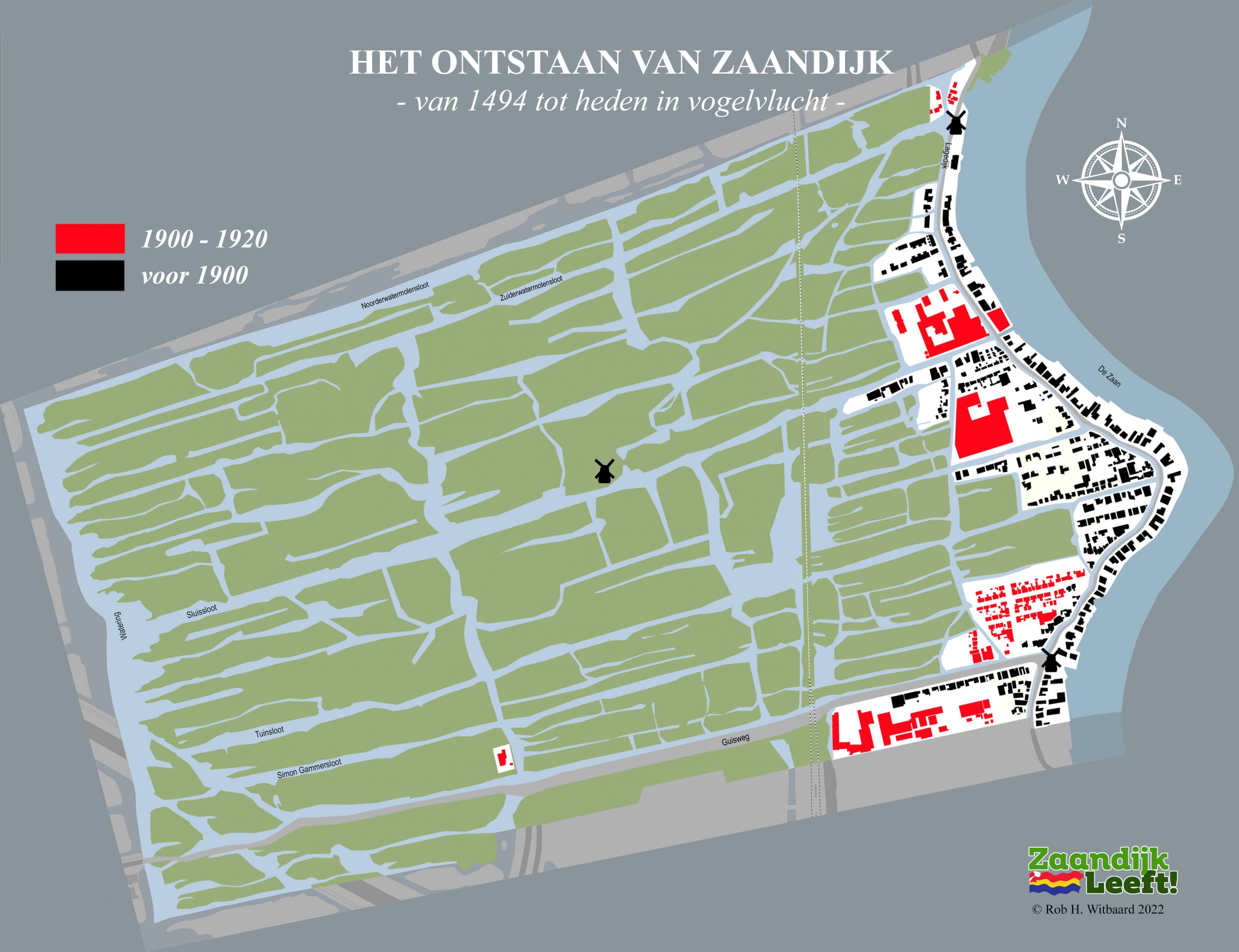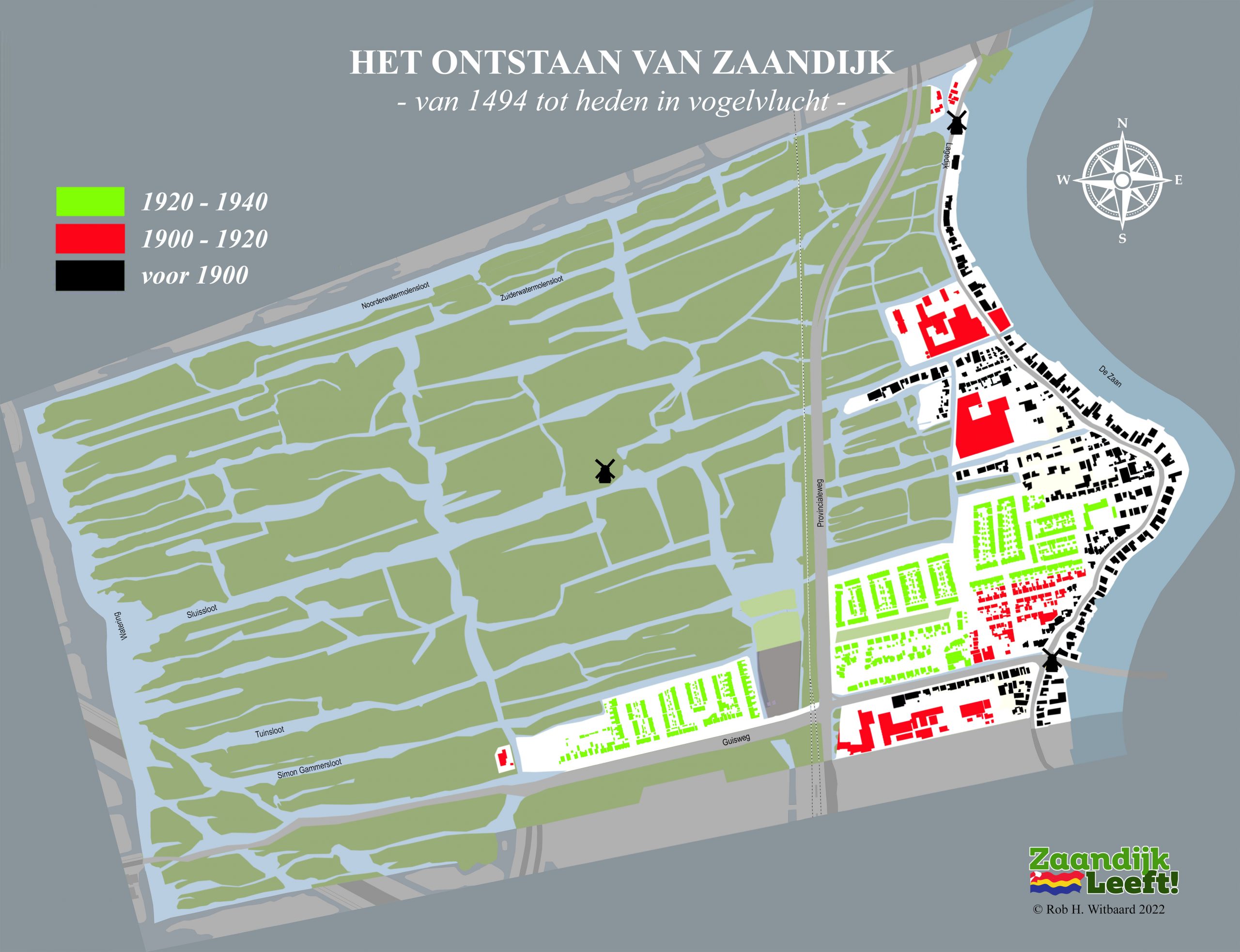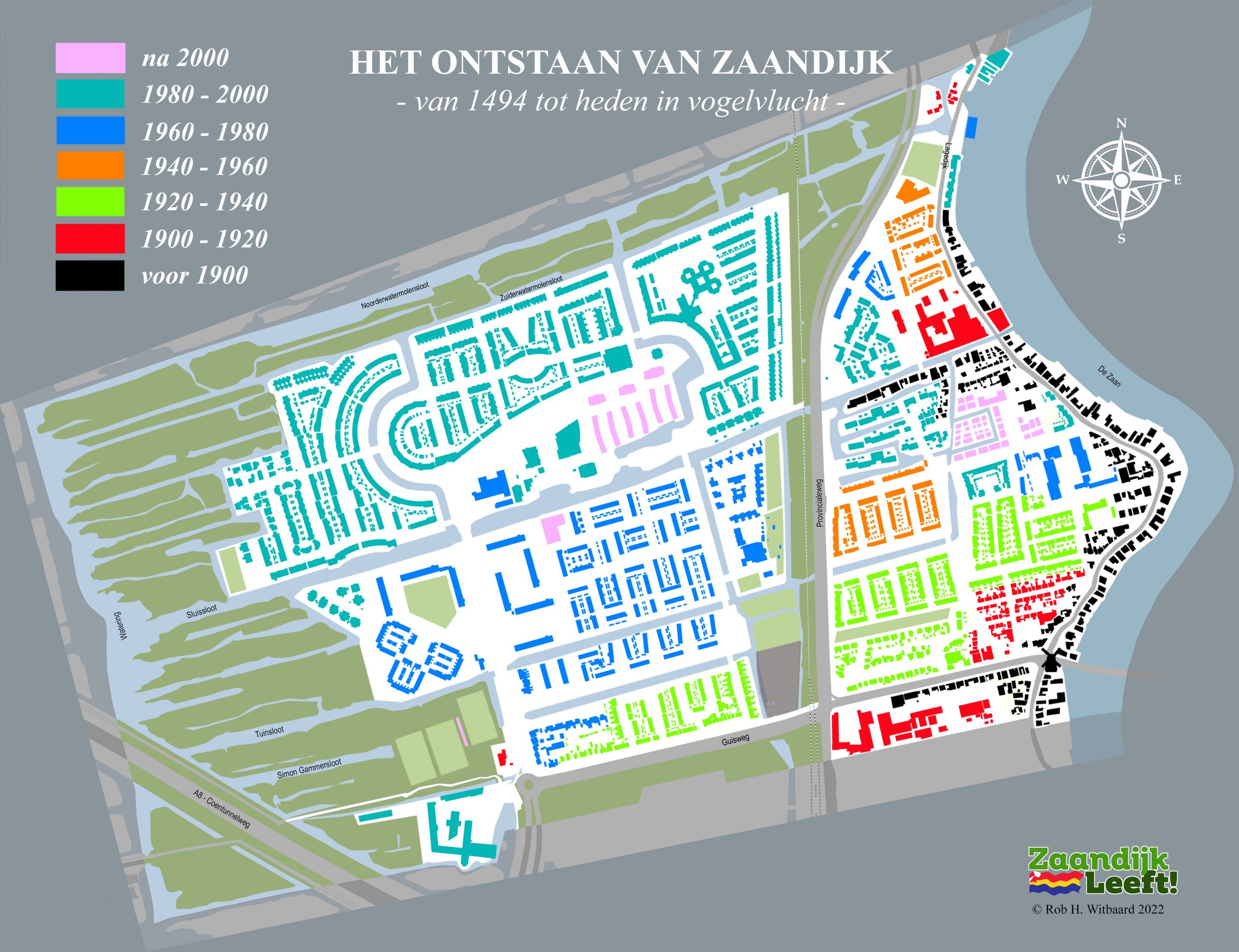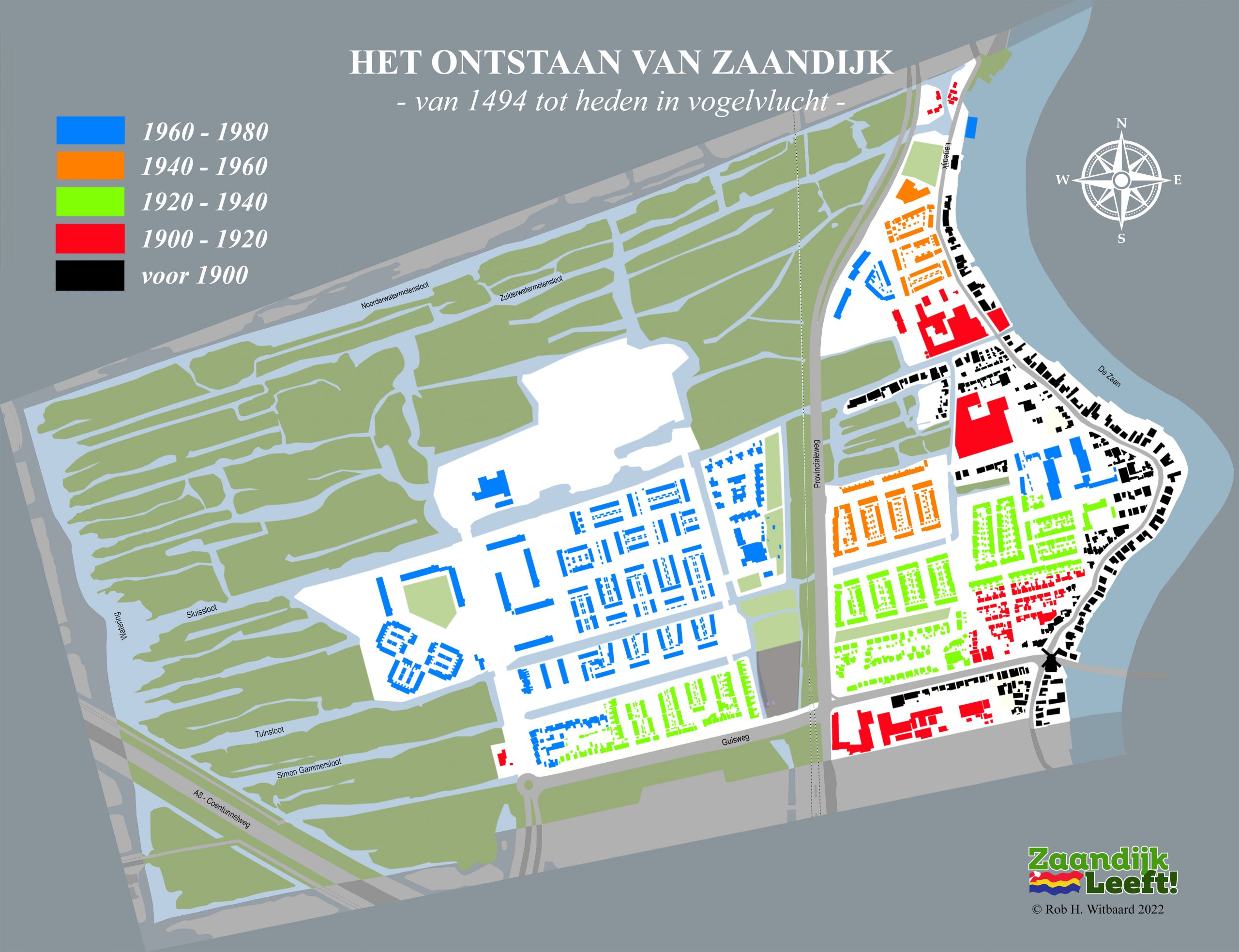 In onderstaande animatie kunt u met de pijltjestoetsen ‘in vogelvlucht’ over ruim 525 jaar bouwen in Zaandijk. De animatie begint natuurlijk in 1494, het jaar waarin Oud Hein zijn huisje bouwde op de lage dijk. Daarna gaat het snel over vier honderd jaar Zaandijk met onder meer d’Vijf Broers en een blik op de 25 molens die ooit draaiden in de drassige, winderige en waterrijke veenpolder. De animatie laat vervolgens de enorme bouwactiviteit zien die plaatsvond in de vorige eeuw. Tussen 1900 en 2000 werd het dorp stap voor stap uitgebreid tot wat het nu is.