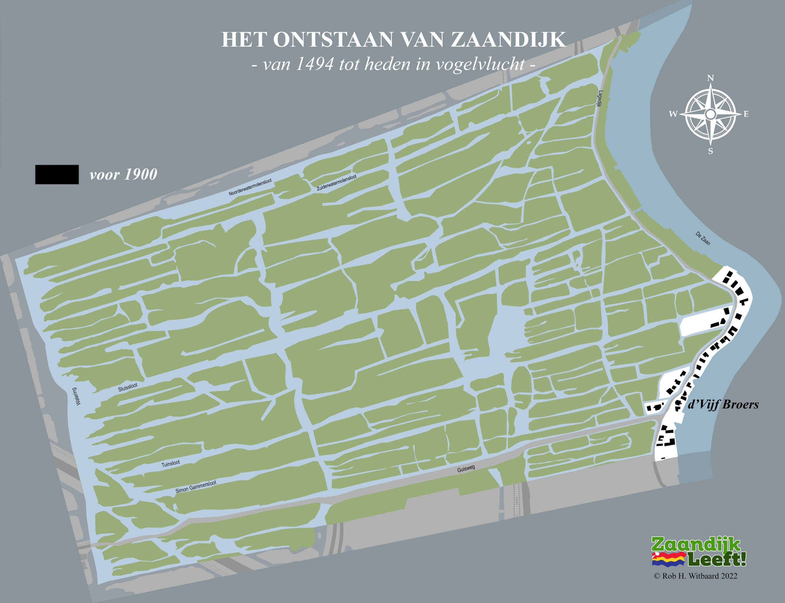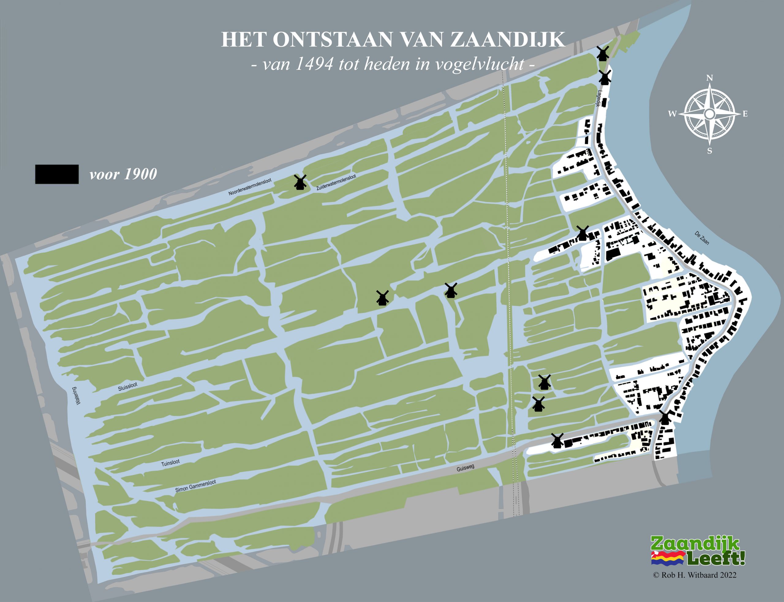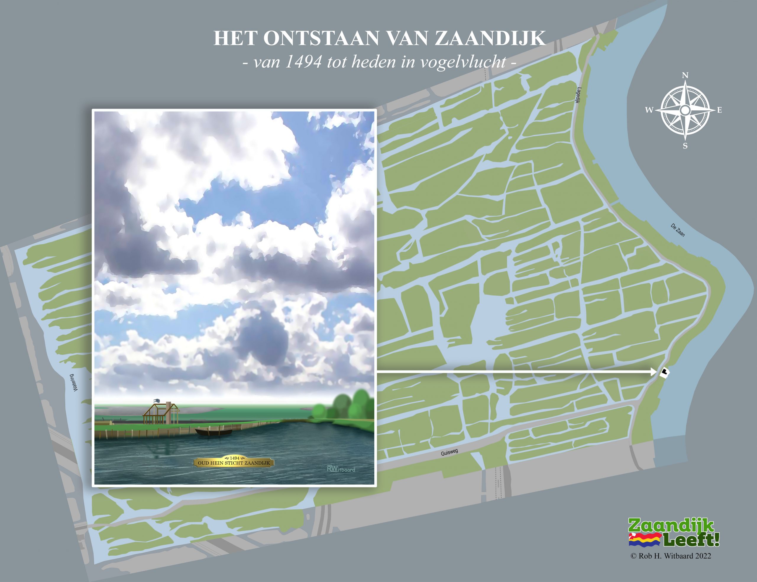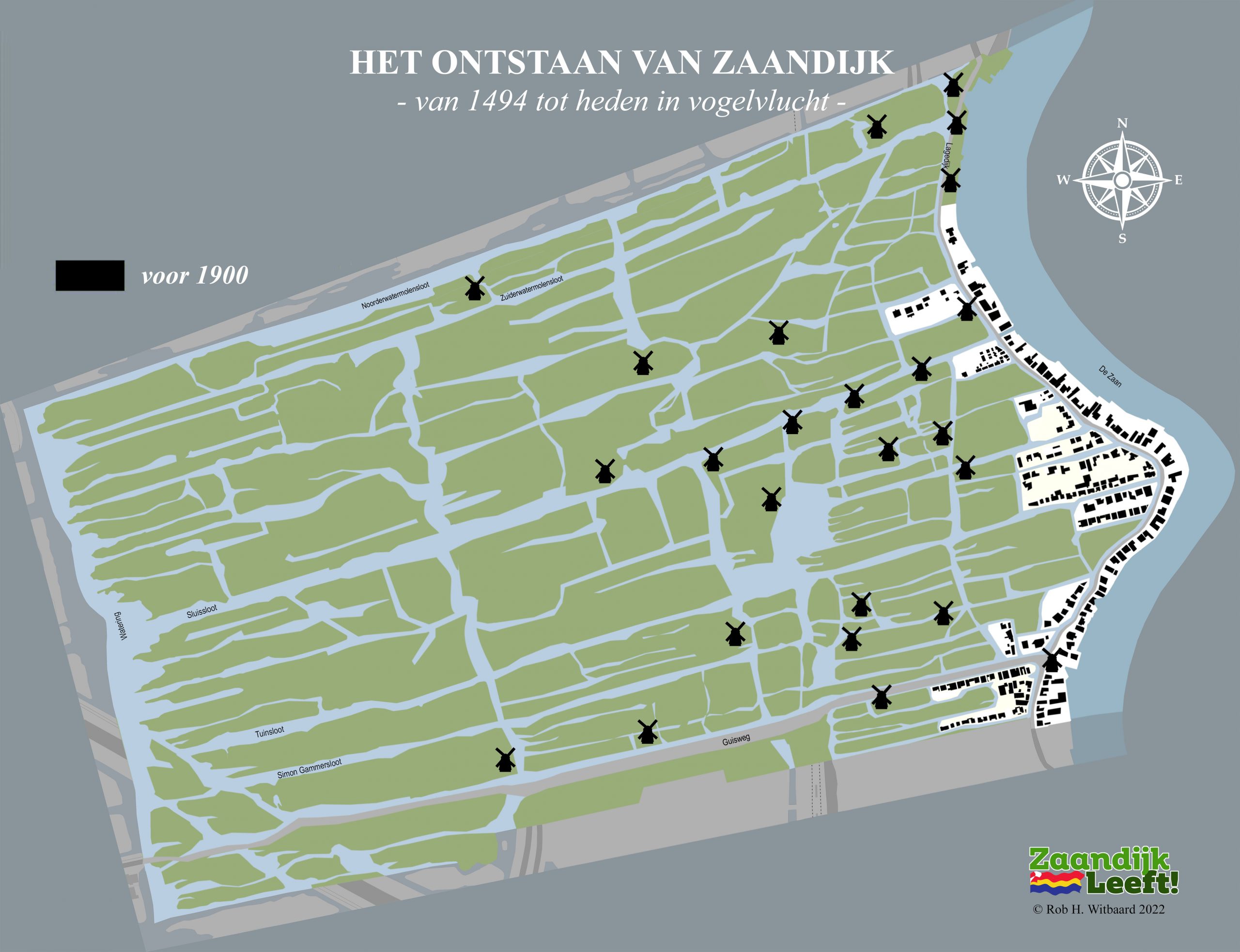 In onderstaande animatie kunt u met de pijltjestoetsen ‘in vogelvlucht’ over ruim 525 jaar bouwen in Zaandijk. De animatie begint natuurlijk in 1494, het jaar waarin Oud Hein zijn huisje bouwde op de lage dijk. Daarna gaat het snel over vier honderd jaar Zaandijk met onder meer d’Vijf Broers en een blik op de 25 molens die ooit draaiden in de drassige, winderige en waterrijke veenpolder. De animatie laat vervolgens de enorme bouwactiviteit zien die plaatsvond in de vorige eeuw. Tussen 1900 en 2000 werd het dorp stap voor stap uitgebreid tot wat het nu is.